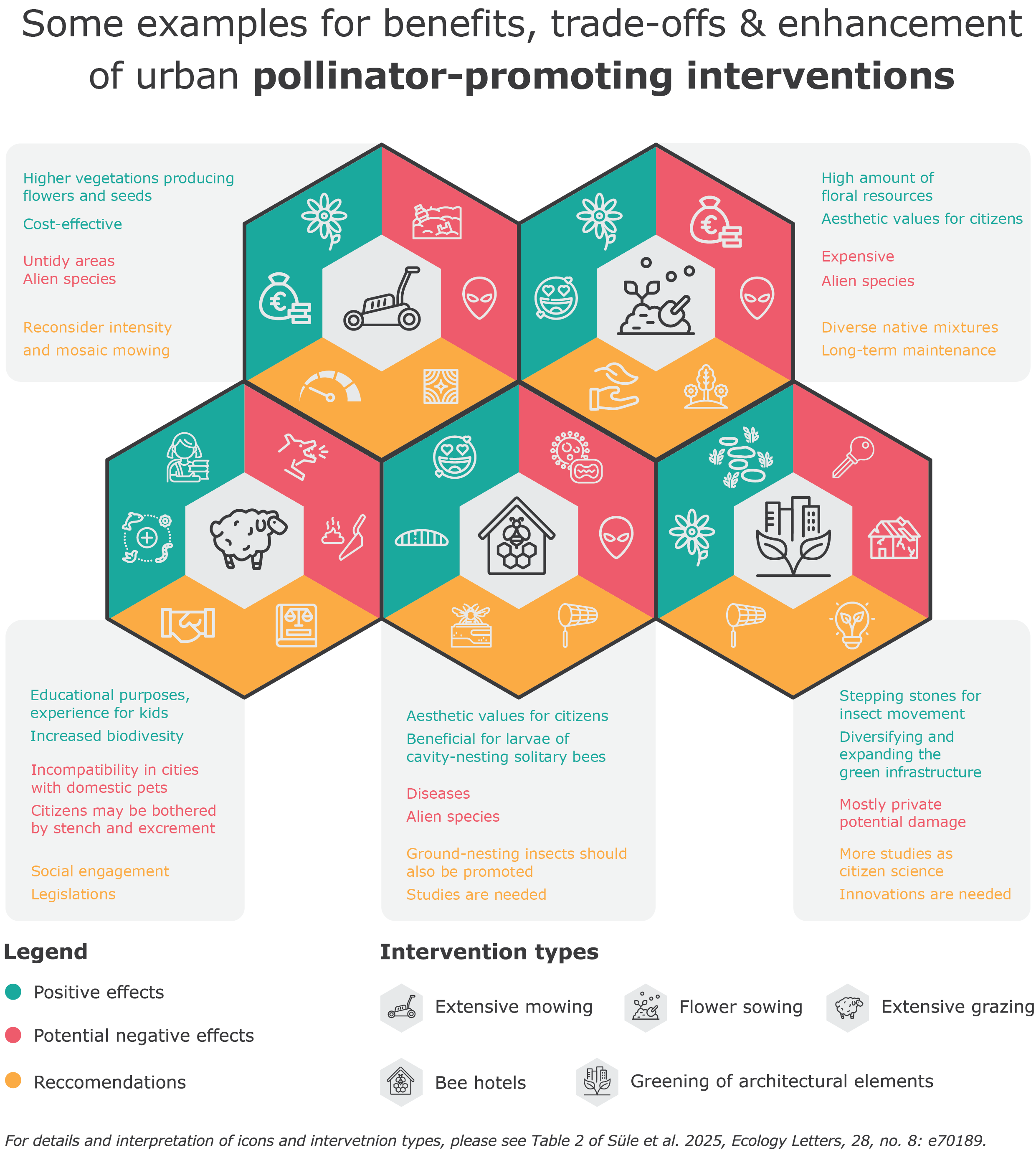 In total, nine intervention types were analysed. The infographic highlights five of them: extensive mowing, grazing, flower sowing, bee hotels, and the greening of architectural elements. For each intervention, it summarises positive effects, as well as potential drawbacks, and provides practical recommendations for implementation.